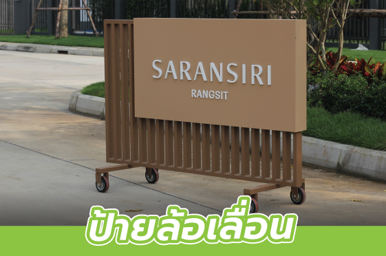 ป้ายที่มีลักษณะเป็นแผงกั้นที่มีล้อเลื่อนยื่นออกมา ผลิตจากวัสดุขอบสังกะสีพ่นสี ขอบซิงค์ สแตนเลส และอะคริลิค